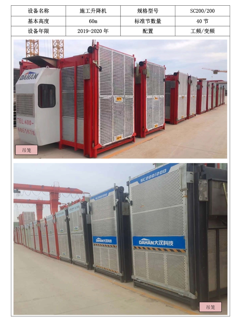 大漢科技股份有限公司發(fā)布二手施工升降機(jī)銷售咨詢信息。拍攝圖片所展示的設(shè)備為二手施工升降機(jī)產(chǎn)品,出廠日期為2019-2020年之間,含變頻、非變頻兩種型號(hào),所有銷售設(shè)備均手續(xù)齊全、檢修保養(yǎng)完畢,以上圖片皆為實(shí)景實(shí)拍,隨時(shí)歡迎有需要的客戶咨詢考察!二手設(shè)備再利用,為您創(chuàng)造新價(jià)值!